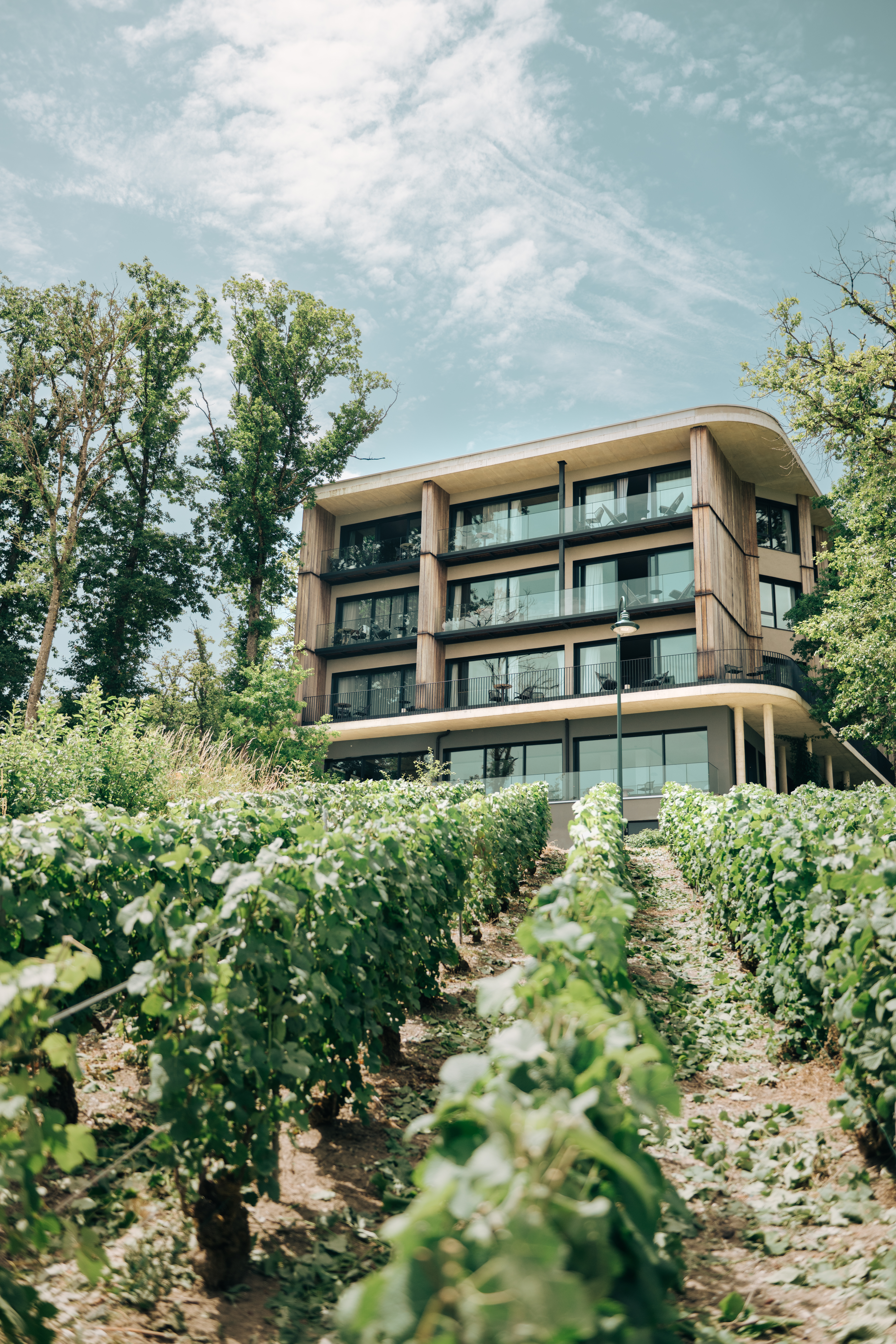 A hotel surrounded by vineyards